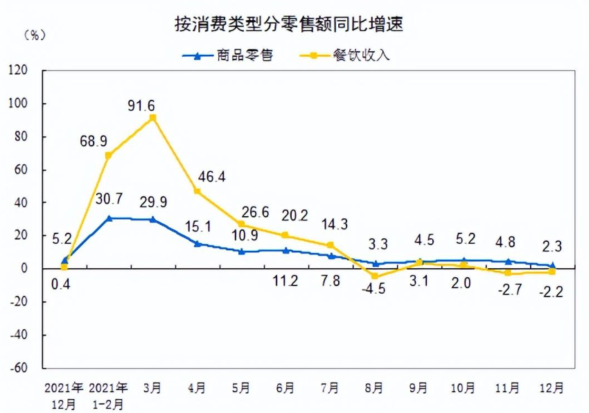 2021年,疫情缓和。消费数据也开始复苏。还是来自国家统计局的数据显示,2021年商品零售393928亿元,比上年增长11.8%;餐饮收入46895亿元,增长18.6%。