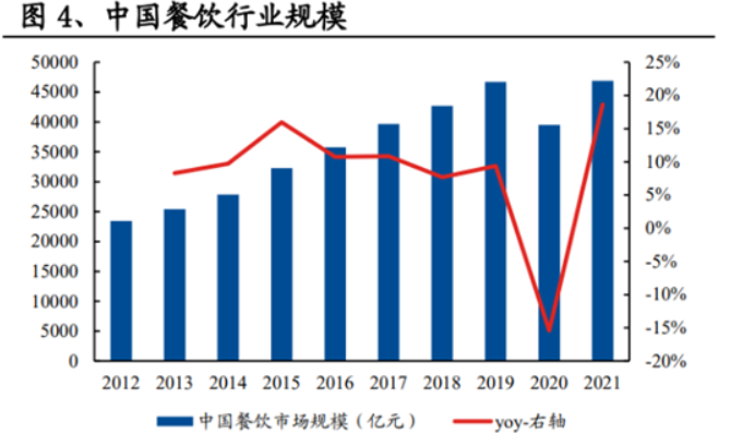 国家统计局数据显示,2021年我国餐饮业规模为4.96万亿元。根据中国饭店业协会数据,2019 年原料进货成本平均占餐饮业营收的41.87%,假设占比不变,则2021年餐饮业原材料市场为1.96万亿元。