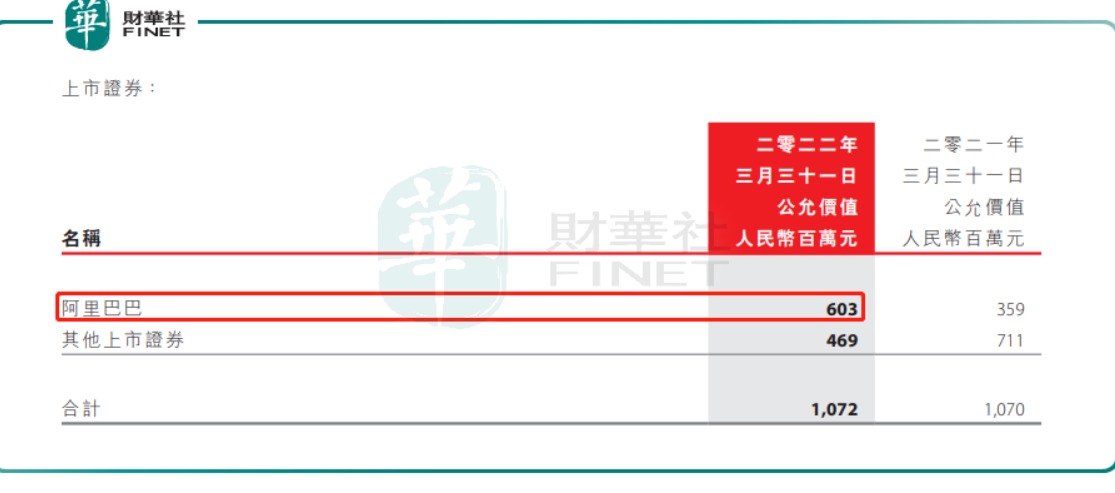 在今年3月底,中国动向投资分部净资产高达84.9亿元,公允价值透过损益列账的金融资产的流动与非流动部分合计达67.25亿元。在投资的股票中,阿里巴巴(09988.HK)是中国动向的“重仓股”,在今年3月底持有阿里巴巴港美股股票的公允价值合共达6.03亿元,持股比例为0.009%。