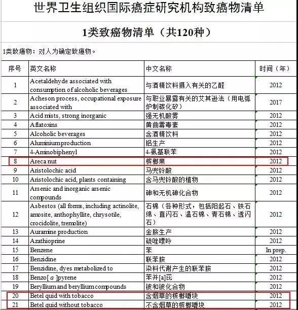 2012年,世界卫生组织公布了120种1类致癌物清单,槟榔赫然在列。
