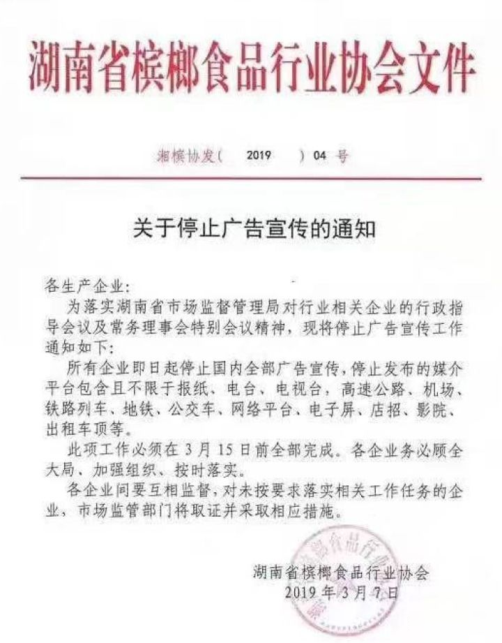 湖南省槟榔食品行业协会在2019年就出台过一个通知,要求所有槟榔企业停止广告宣传。