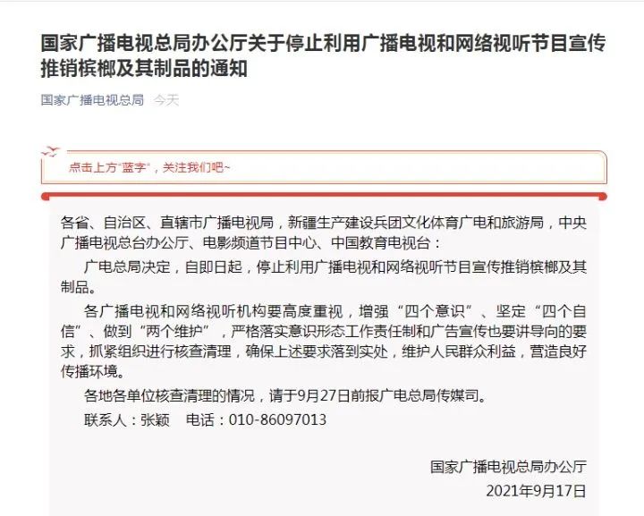 2021年9月,国家广播电视总局出台通知,严禁广播电视和网络视听节目宣传推销槟榔及其制品。