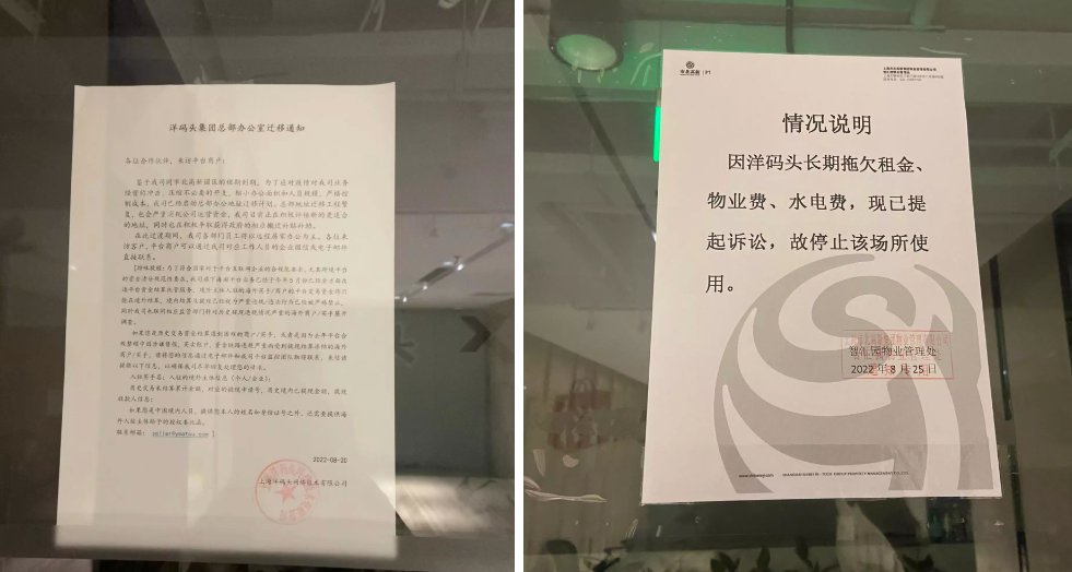 门上贴着两张公告,一张来自物业,写着“因洋码头长期拖欠租金、物业费、水电费,现已提起诉讼,故停止该场所使用”。