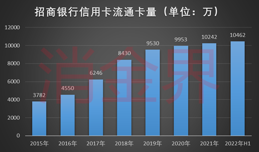 2019年之前,招商银行信用卡流通卡量和流通户数都呈高速增长态势。2015年招商银行流通卡数量为3782万张,到2019年达到了9530万张,四年翻了2.5倍多。流通户数也由2015年的3103万,上升到2019年的6450万张,增长了两倍多。