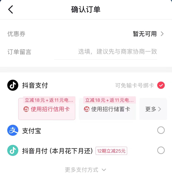 近期,在抖音购物确认订单时,支付通道会跳出好几个选项,抖音自己的“抖音支付”自然排在首位,而在抖音支付中,露出的选项分别为“招商银行信用卡”和“招商银行储蓄卡”,并标注了使用招行信用卡和储蓄卡支付的活动优惠。