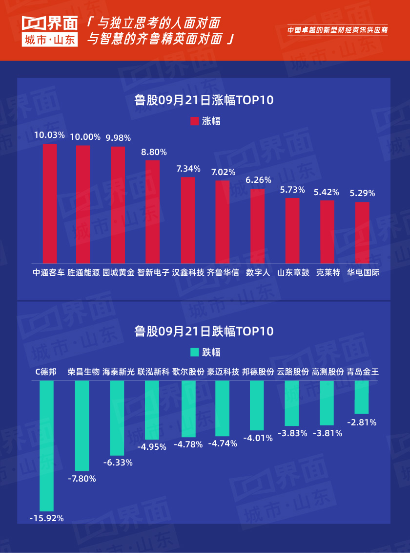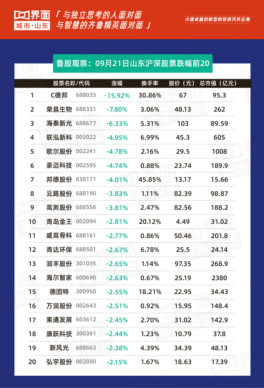 9月21日,山东179只个股上涨,94只个股下跌。