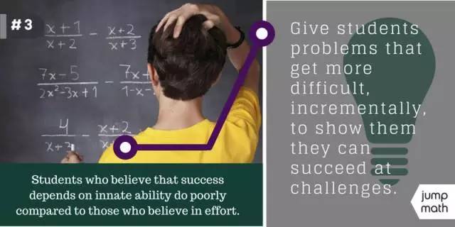 3障碍3:相信成功取决于与生俱来的能力的学生比相信成功取决于努力的人表现更差。对策:给学生越来越难的问题,让他们知道通过自己的努力可以克服任何挑战。当他们在承担适度的风险的同时有所积极回报的时候学习效果最好。