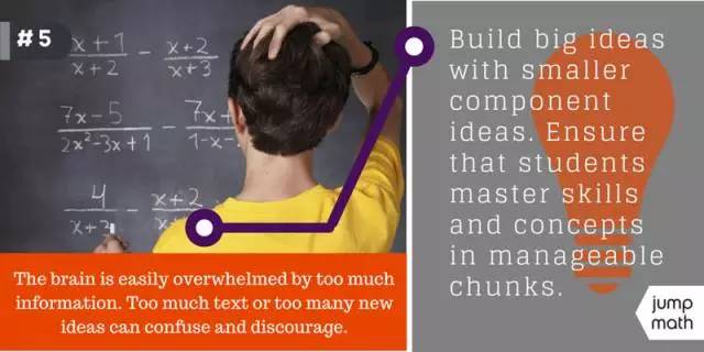 5障碍5:大脑在处理太多新信息时很容易超负荷;在一张试卷上过于复杂或情境较多的数学问题将阻碍学生并使他们感到沮丧。对策:研究表明,“大创意”必须系统地建立在小的想法上。在教授复杂内容时应该从可以保证学生有足够能力处理的问题开始。随着学生能力的提升,再让他们探索更复杂或开放式的问题。研究还表明,概念性与程序性知识的学习是交替迭代发展的,提升了其中一个方面,相应的其他方面的也会随之提升。有效的课程可以让孩子们同时开发这两种知识。