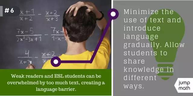 6障碍6:阅读能力差和母语是非英语的学生会被太多的文字所困扰,语言成为学习数学的障碍。对策:尽量减少文本在学生材料中的使用,并严格的使用语言。要求学生与老师沟通他们的理解,同时当写出来很困难的时候允许使用图片、数字或口头回答。