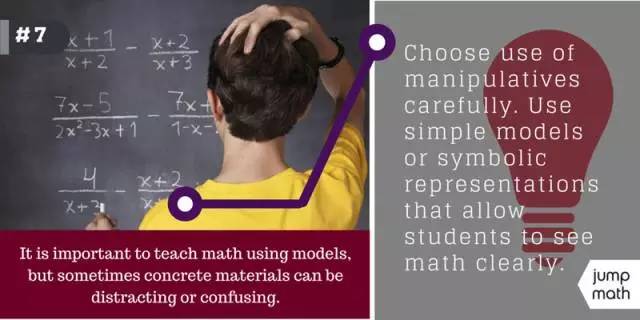 7障碍7:教授数学时使用模型很重要,但有时实际的物体会让学生感到分散或困惑:学生不一定在非结构化的课程中能有效地使用这些模型。对策:使用简单的模型或符号表示,让学生清楚地认识数学,而不是被细节分散注意力。说明概念时使用各种具体的陈述,并确保每一个描述都是严格的。