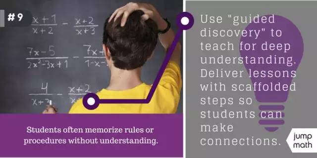 9障碍9:学生经常是在不理解的情况下记住运算规则和步骤的。这使他们仅仅能简单的给出答案,但没有完成真正的理解:数学并不总能对他们产生意义。对策:使用“引导发现”的方法以加深理解:一步一步的安排课程,让一个概念自然引出下一个概念,让学生有足够的实践来掌握这些概念,让学生自己去探索知识点之间的联系。