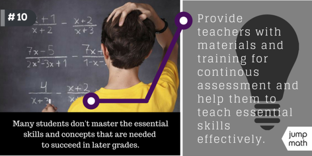 10障碍10:为了能在以后的学习中取得成功,学生必须掌握小学课程中所教授的概念和技巧。但让有许多学生不能很好的掌握这些概念技巧。对策:为教师提供教材和培训,让他们不断评估学生的学习情况,从而有效地进行基本技巧和概念的教授。