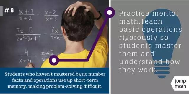 8障碍8:那些没有掌握基本的数字概念与运算的学生,还不能将其转换成长期的记忆,因此学生只能使用短期记忆,而短期记忆能力不足以解决问题。那些还没有掌握基本概念的学生也无法掌握解题模式并对问题作出估计和预测。对策:进行心算练习。让学生进行计算时找到适合自己的策略,但同时要教授严格的基本运算,这样学生可以掌握和理解运算的方式。