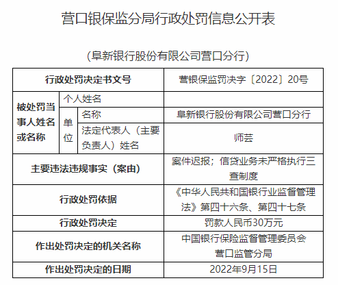 银保监会辽宁监管局9月21日发布行政处罚信息公开表。阜新银行股份有限公司营口分行因案件迟报,信贷业务未严格执行三查制度,9月15日被营口银保监分局罚款人民币30万元。