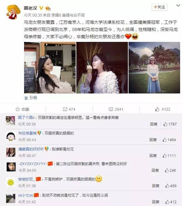 许昕公布了与女朋友的恋情后,马龙的女朋友夏露也被一些营销号曝光,有人就说妹子是整容脸。