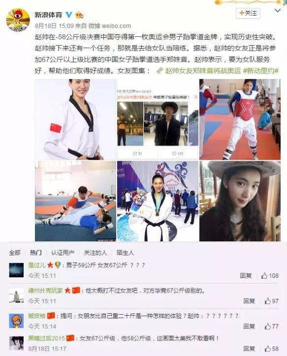 其他项目上的选手也是逃不过这些无聊的言论。赵帅在男子跆拳道58公斤级决赛中战胜泰国选手他温汉班,获得历史上中国男子跆拳道队奥运会的第一枚金牌,也是本次奥运的第19金。这样开创时代的英雄还要为女队的女朋友当陪练,本是一段佳话,却被人拿他和女朋友的体重差来调侃。