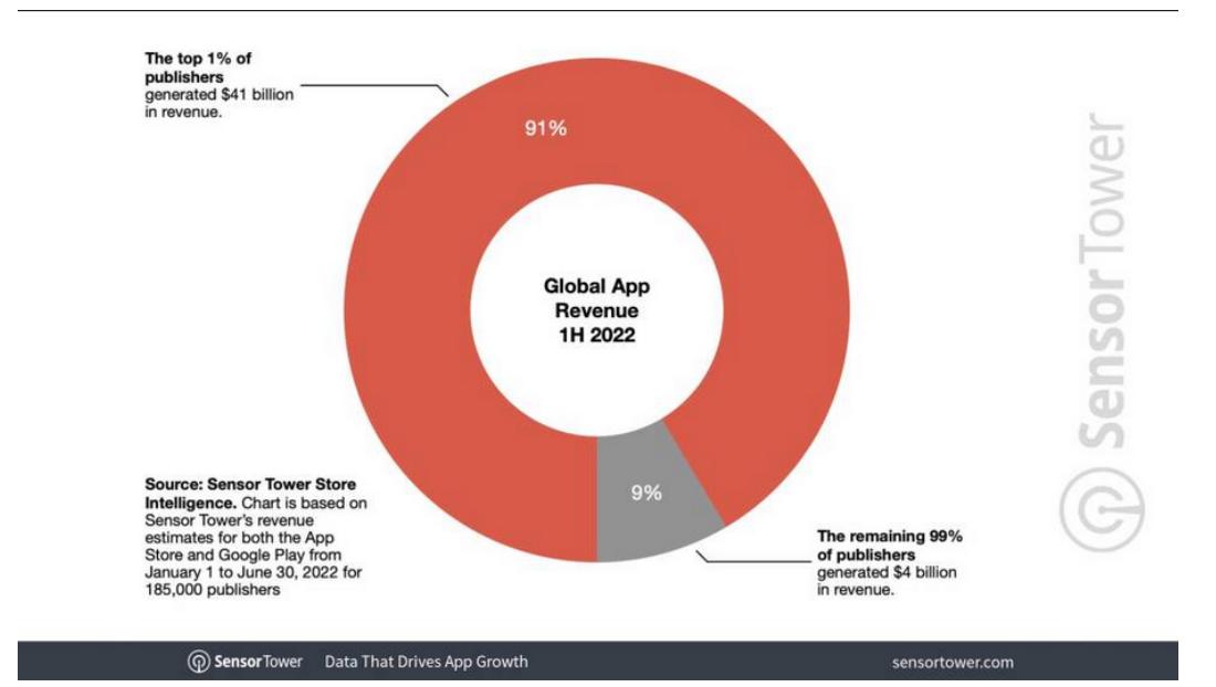 Sensor Tower 近期发布的一份报告抛出了吸人眼球的结论,2022上半年全球手游市场1%(460家)的厂商创造了93%的行业收入,约为270亿美元,余下的20亿美元由46000+厂商共得。放眼App市场整体也是类似的结论,1%的开发商占据了上半年收入的91%,约420亿美元。