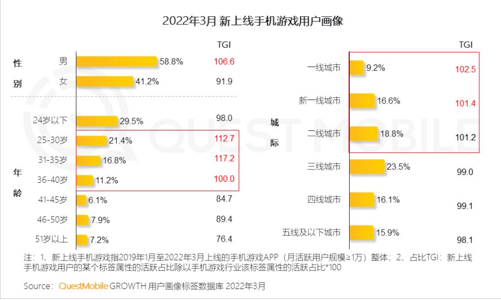 QuestMobile此前发布的《2022手机游戏行业洞察报告》显示,截止到2022年3月,31岁以上用户占比达到51%,其中,36岁以上用户占比36.6%,超过了24岁以下年龄段用户。而在2019年3月,30岁及以下用户占比55.5%,36岁以上用户占比仅为30.2%。近三年新上线的产品中,25-40岁用户占比近半。