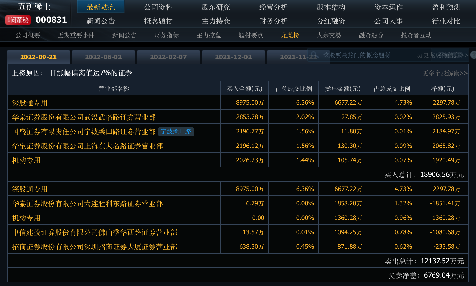 龙虎榜显示,9月21日买入五矿稀土金额最大的席位是“深股通专用”,买入金额达到了8975万元,占总成交比例6.36%,而华泰证券武汉武珞路营业部以2853.78万元的买入金额位列第二,国盛证券宁波桑田路营业部、华宝证券上海东大名路营业部,以及一家“机构专用”席位均有上榜;然而看卖出前五席位,排在第一的依然是“深股通专用”席位,卖出金额6677.22万元,这也使得该席位当天的净额为2297.78万元。买卖前五席位的买卖净差为6769.04万元。