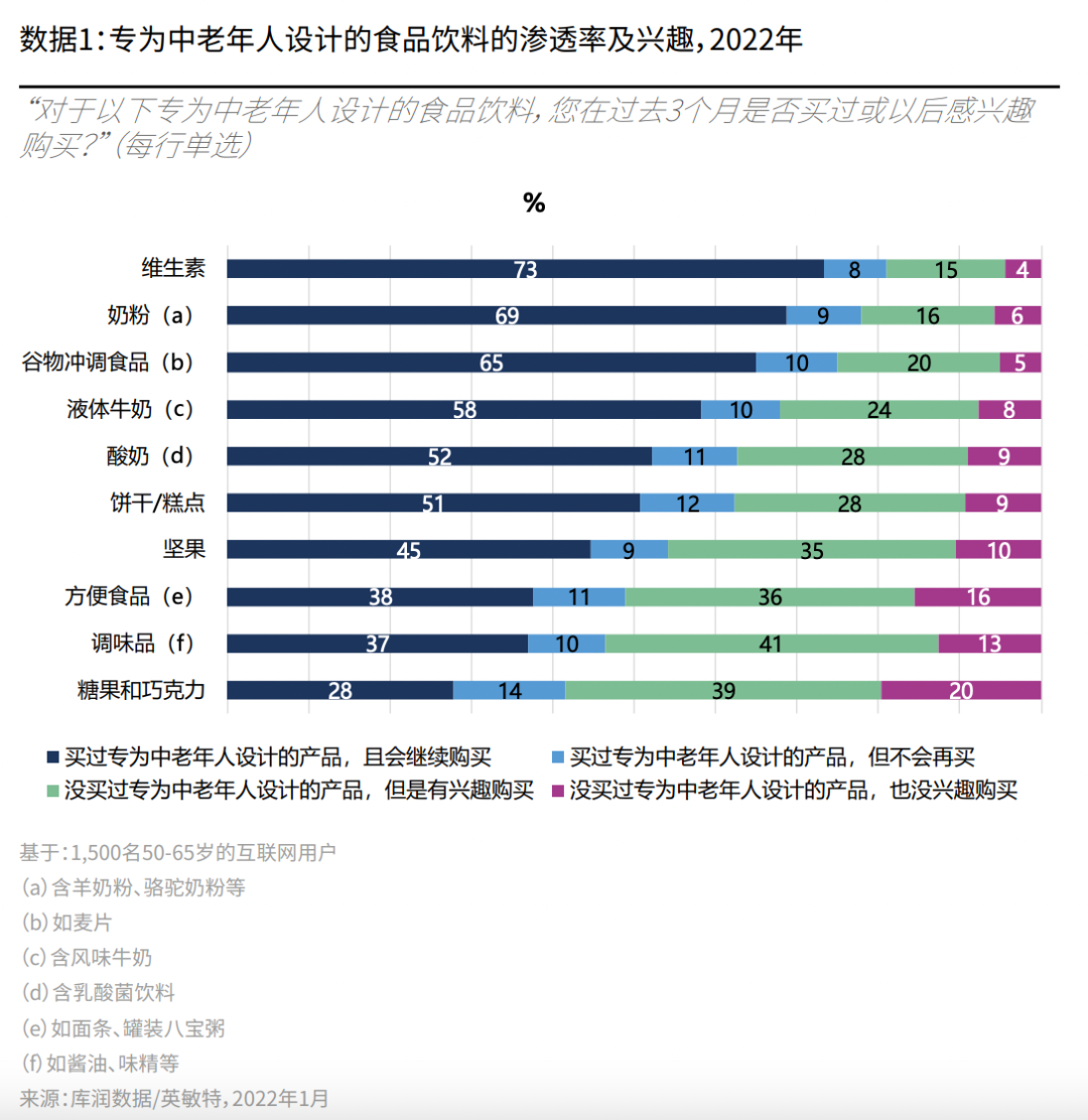 小食代从英敏特处拿到的2022年中国《中老年食品饮料消费趋势报告》称,基于1500名50~65岁互联网用户的调研结果显示,维生素是中老年人群购买渗透率最高的品类,其次是奶粉、谷物冲调食品、液体牛奶、酸奶。