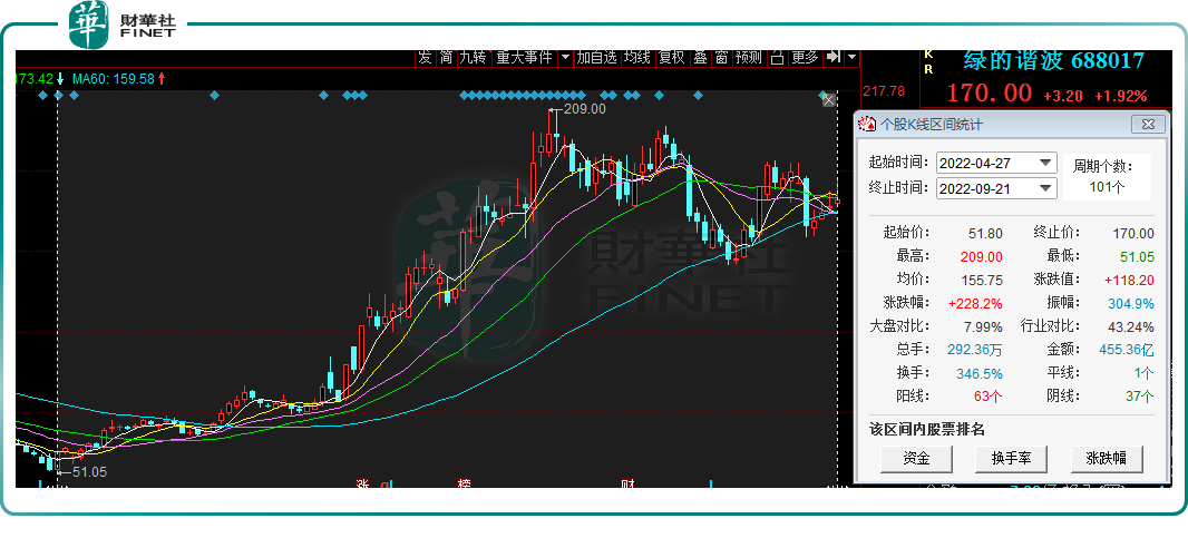 国内谐波减速器绝对龙头绿的谐波(688017.SH),自然成为投资者追捧的焦点。自4月27日起该股便一路走高,在7月29日涨至209元,短短3个月大涨超300%,迄今累计涨幅仍2倍有余。