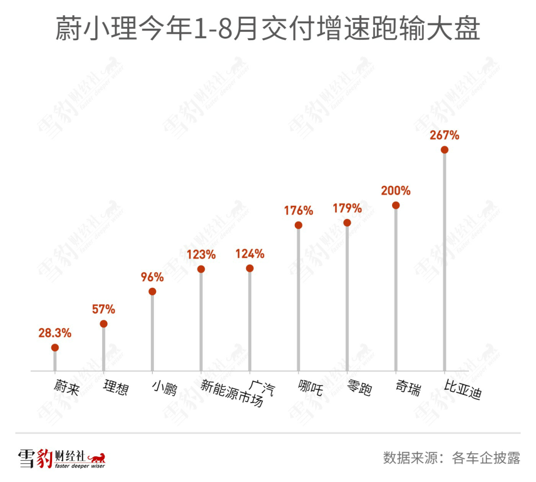 尴尬的现状背后,是新势力三强销量增速集体放缓。1-8月,蔚小理交付同比增速分别为28.3%、96%、57%,远逊于去年同期三位数的增速,也低于新能源汽车123%的整体增速。