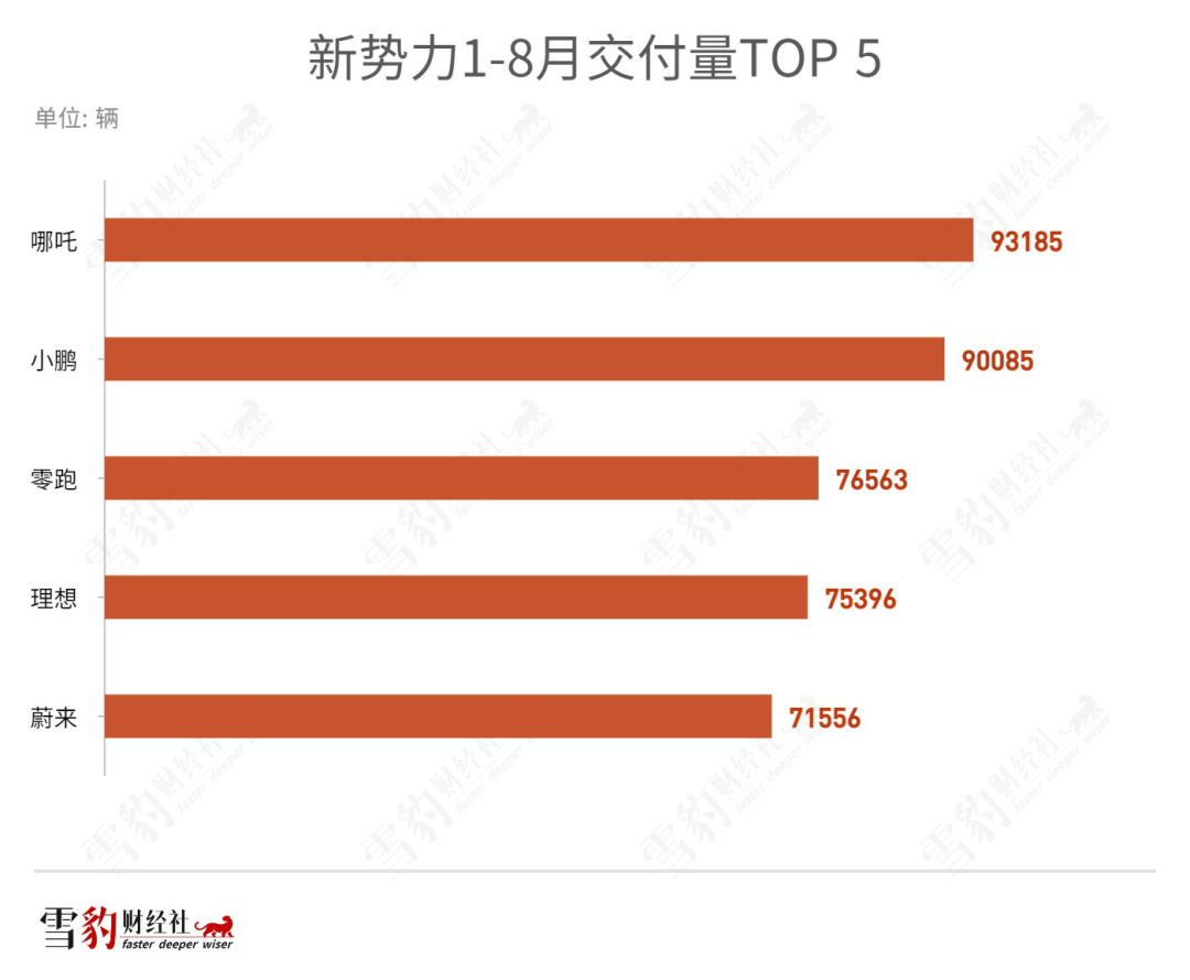 从今年1-8月的交付量来看,蔚小理累计销量分别为7.2万、9万和7.5万辆。新势力交付冠军的宝座,被哪吒以9.3万辆的成绩夺走。近两个月,昔日牢牢占据榜单前三的“铁打的蔚小理”,将冠军和亚军的位置让给了哪吒和零跑。