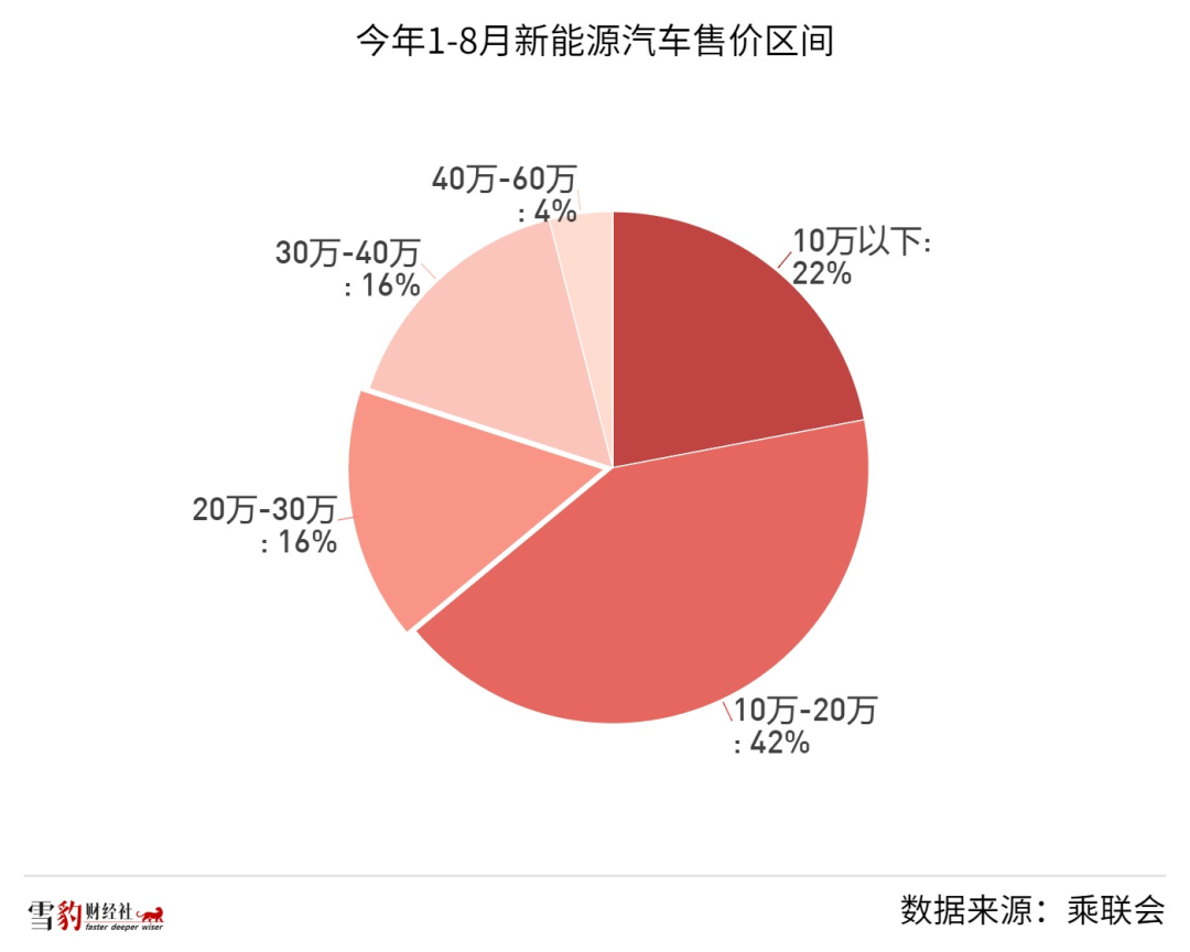 新能源汽车市场渗透率上升至近15%,进入爆发期,同时售价30万元以下车型成为市场主导。据乘联会最新数据,2022年1-8月,20万元级别的新能源汽车销量占比达64%,30万元以下产品占据8成市场。