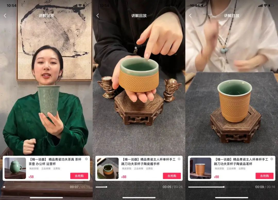 观察“楠一青瓷”直播间的数据,可以发现,与传统的瓷器直播间销量最高的多是斗笠杯、扳指杯等常规物件不同,这个直播间里最热销的是小动物形制的青瓷摆件,这意味着:为实现直播“人-货-场”的创新和创意,直播间不止在内容上下了功夫,在“货”上也尝试对年轻用户的偏好做了差异化布局。