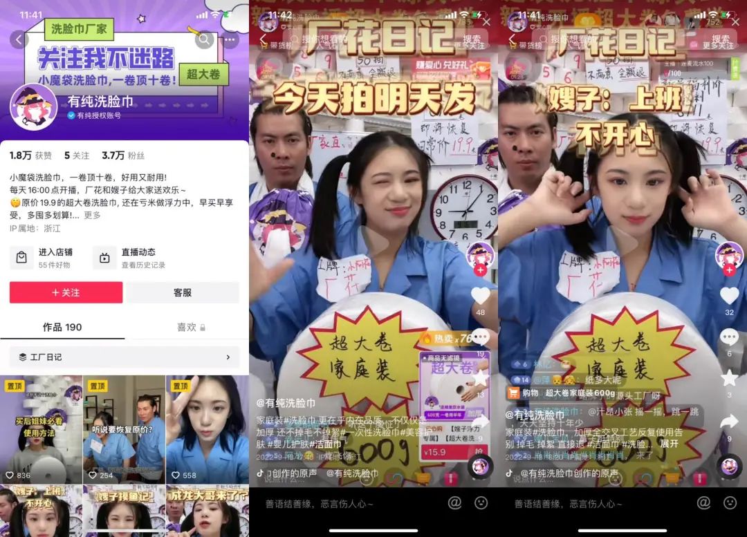 比如在“有纯洗脸巾”的直播间里,扎着双马尾的厂花阿花举着超大卷的洗脸巾在前面念着顺口溜直播卖货,后面还会站着一个举着洗脸巾的工具人一起随着节奏摇晃律动。