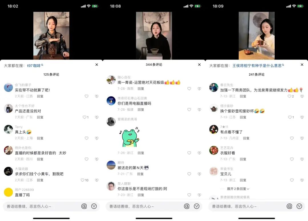 在翻阅“楠一青瓷”直播间、短视频的评论区里相关内容后发现,来围观、互动的账号基本上是行业内运营人士。