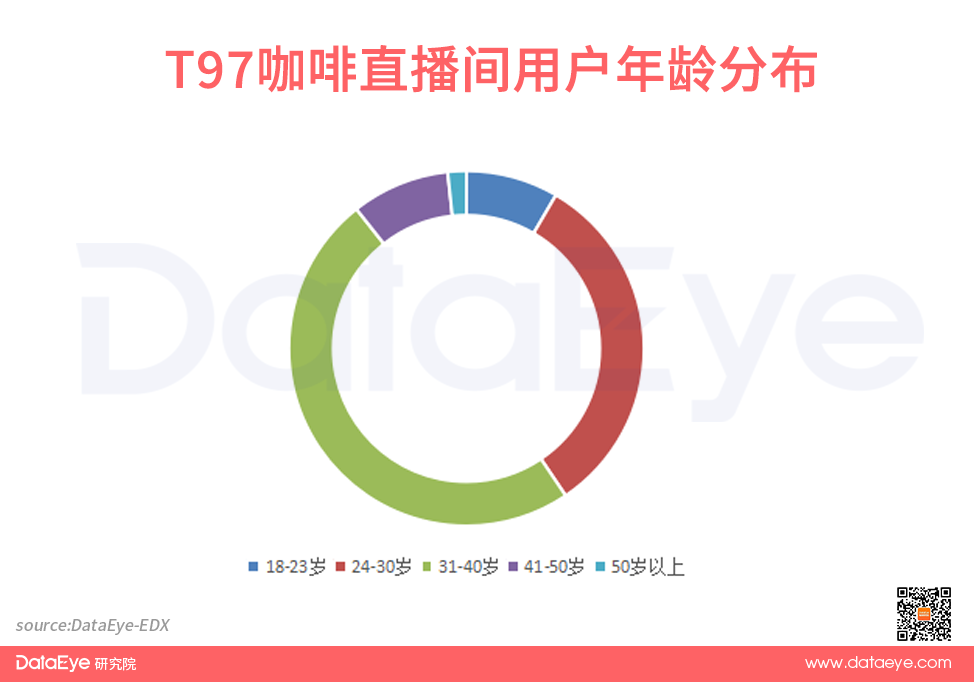观看@T97咖啡旗舰店的直播间用户画像中,男性用户多于女性用户,占比75.84%,年龄分布方面24~30岁用户占比44.45%,接近过半。整体看用户层级比较泛,且因为销售咖啡兑换券,来自杭州、广州、上海等一线城市用户较多。