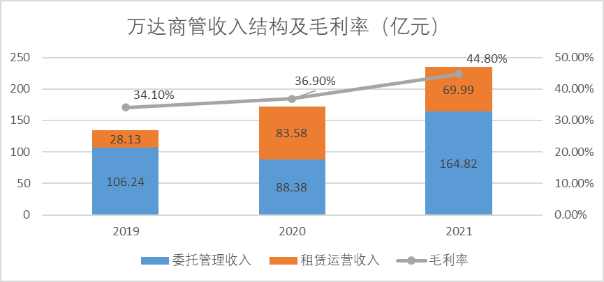 委管模式下来自万达集团业务毛利率48.4%,来自第三方业务毛利率45.5%;租赁模式下来自万达集团业务毛利率45.3%,来自第三方业务毛利率35.4%。