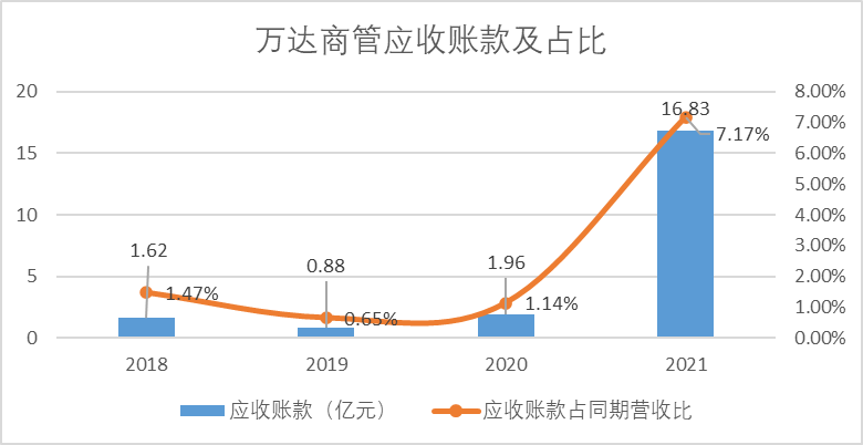 另外,万达商管的应收账款激增,2018年应收账款仅为1.62亿,而2021年应收账款达到了16.83亿,增长超过了十倍。应收占营收比也由1.47%飙升至7.17%,应收增速明显高于营收增速。