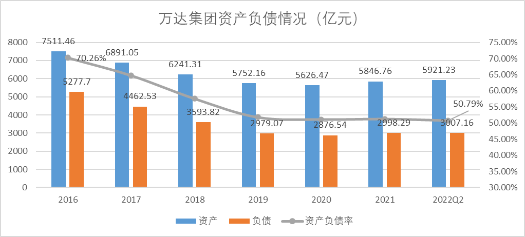 期间,资产由2016年7511.46亿减少至2022年Q2的5921.23亿元,负债由5277.7亿元减少至2022年Q2的3007.16元,资产负债率由2016年的70.26%降低至2022Q2的50.79%,回归红线以下。毫无疑问,万达的轻资产策略减持的很好,降负债的效果也不错。
