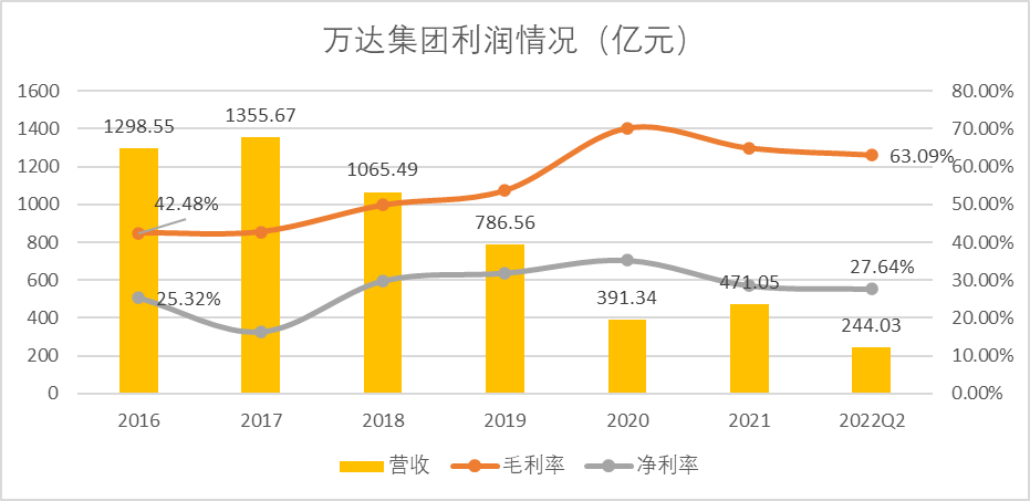这一过程中,万达集团营收由2016年的1298.55亿下降至2021年的471.05亿,毛利率增长超20个百分点,由42.48%增长至63.09%,净利润率基本没有变化。
