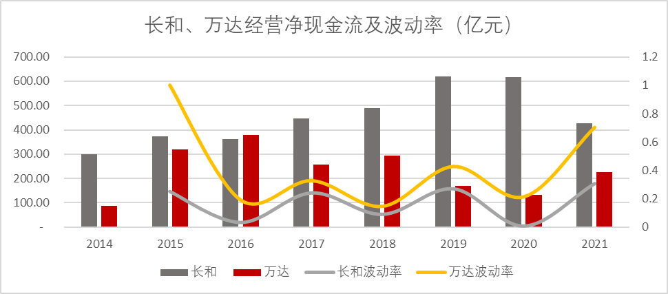 (图:长和、万达经营现金流及波动率 来源:Choice金融客户端)