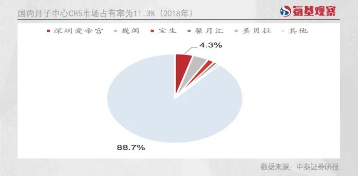 目前,中国月子中心行业并未跑出一个真正的龙头。如下图所示,中国大陆前五大月子中心市场占有率不过10%出头。行业龙头爱帝宫的市场占有率,也不过4.3%。某种程度上来说,这也是月子中心尚未跑出大公司的原因。