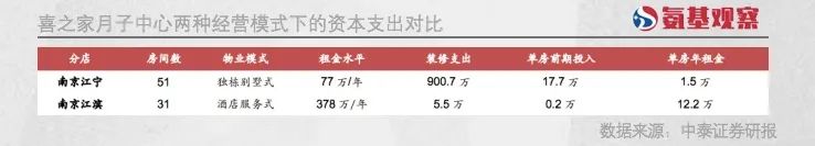 酒店服务式已经属于“轻资产模式”,只需要租赁酒店客房改造成月子中心即可,但租金成本往往较高。如下图所示,喜之家酒店模式31个房间数量对应的年租金为378万/年。