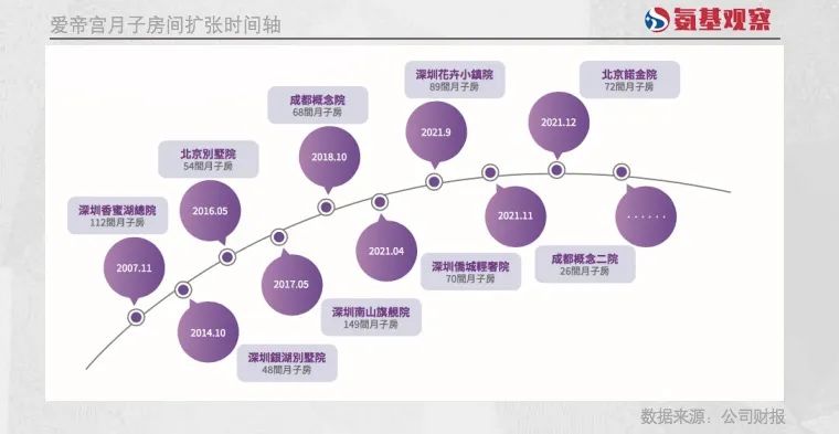 在资本助力下,爱帝宫便通过轻资产模式开启加速度,2021年新增275间月子房。而在2021年之前,公司所有月子房数量不过435间。