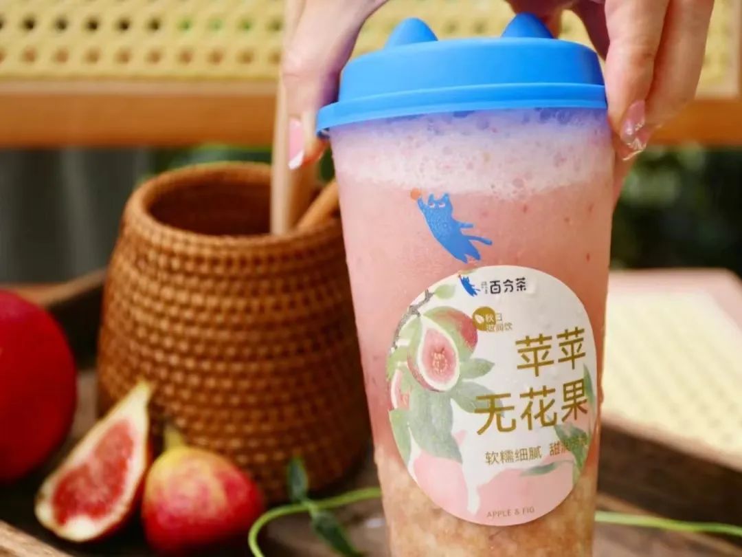 喜茶首次上新柿子茶“喜柿多多”,第一天就刷屏了小红书;百分茶上了一款“苹苹无花果”,苹果+无花果的搭配,也让人眼前一亮。