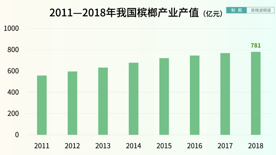 槟榔致癌宣传多年,但“槟榔加烟,法力无边;槟榔泡酒,永垂不朽”的神话,推动着槟榔产业的壮大,据《中国市场监管报》披露,2018年槟榔的产值已经达到781亿元。