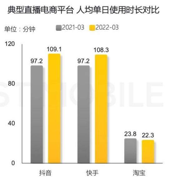2022年的抖音用户日活已经超过7亿,而淘宝将主要关注指标由原本的年度消费者数量(AAC),切换成了日活跃用户数量(DAU),约为3.6亿,只有抖音的一半。用户使用时长方面,三大直播电商平台中抖音和快手并驾齐驱,淘系约为前者的五分之一。