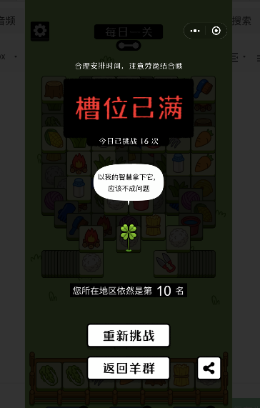 近日,一款类似消消乐的消除闯关游戏《羊了个羊》迅速登上热搜,玩家点击游戏中的物品,并转移至游戏界面下方的槽内,出现连续三个相同的物品就可以消除,槽位满了但物品仍未清理完则通关失败。而通关成功,则可以进入到省或地级市的榜单,从而助力地区排名。
