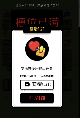 为了能够让玩家更多的看广告,游戏设置了3个广告窗口,分别在移出、撤销、随机这三个道具中,都增加了只有看完足够时长的广告,才能获得复活,而最后还有一次额外复活机会也是要看完足够时长的广告