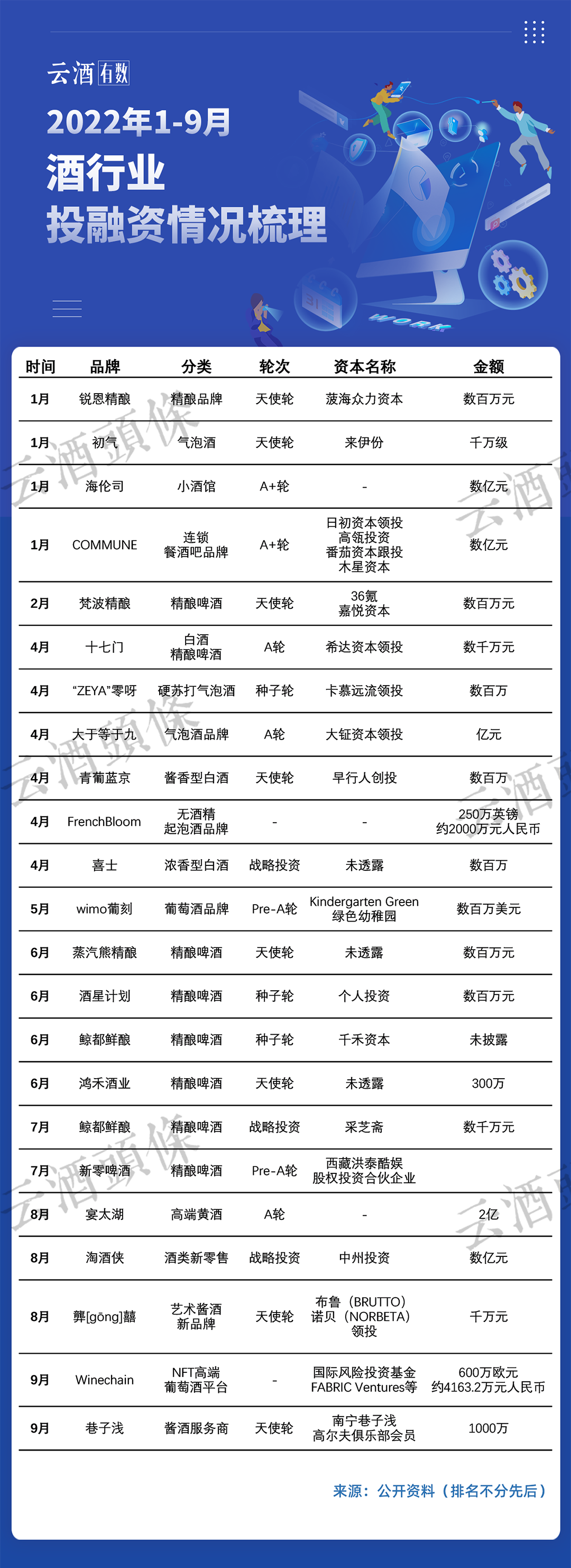 从融资规模来看,百万级投融资事件有8起,占比超过30%;从融资轮次上看,1-9月酒行业融资主要以种子轮和天使轮为主。