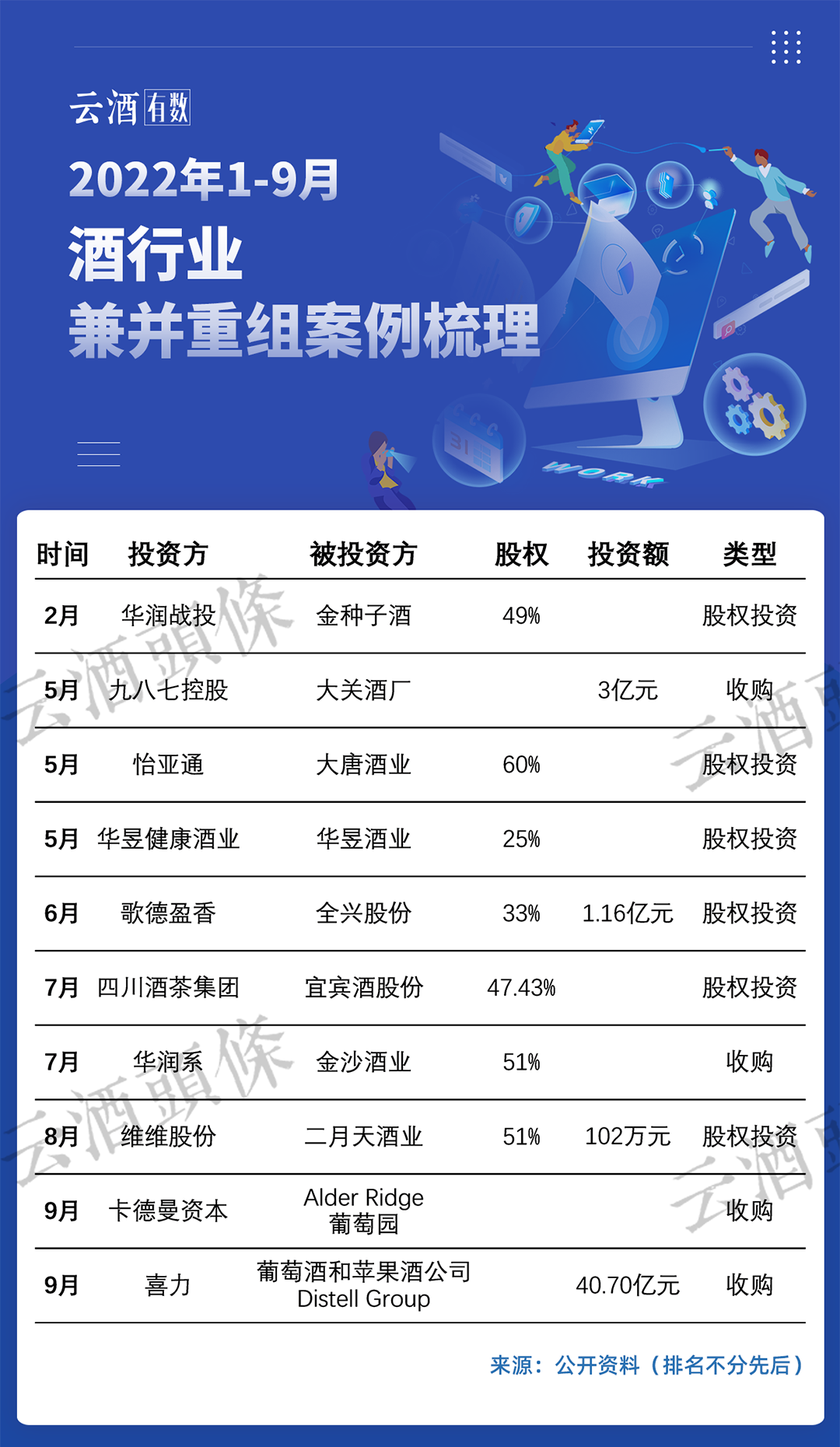 2022年酒行业10起兼并重组案例中,战略股权投资为主力,既有产业链布局的延伸,也有跨界资本以收购或者股权投资的方式涉猎酒行业,更有产业资本整合。