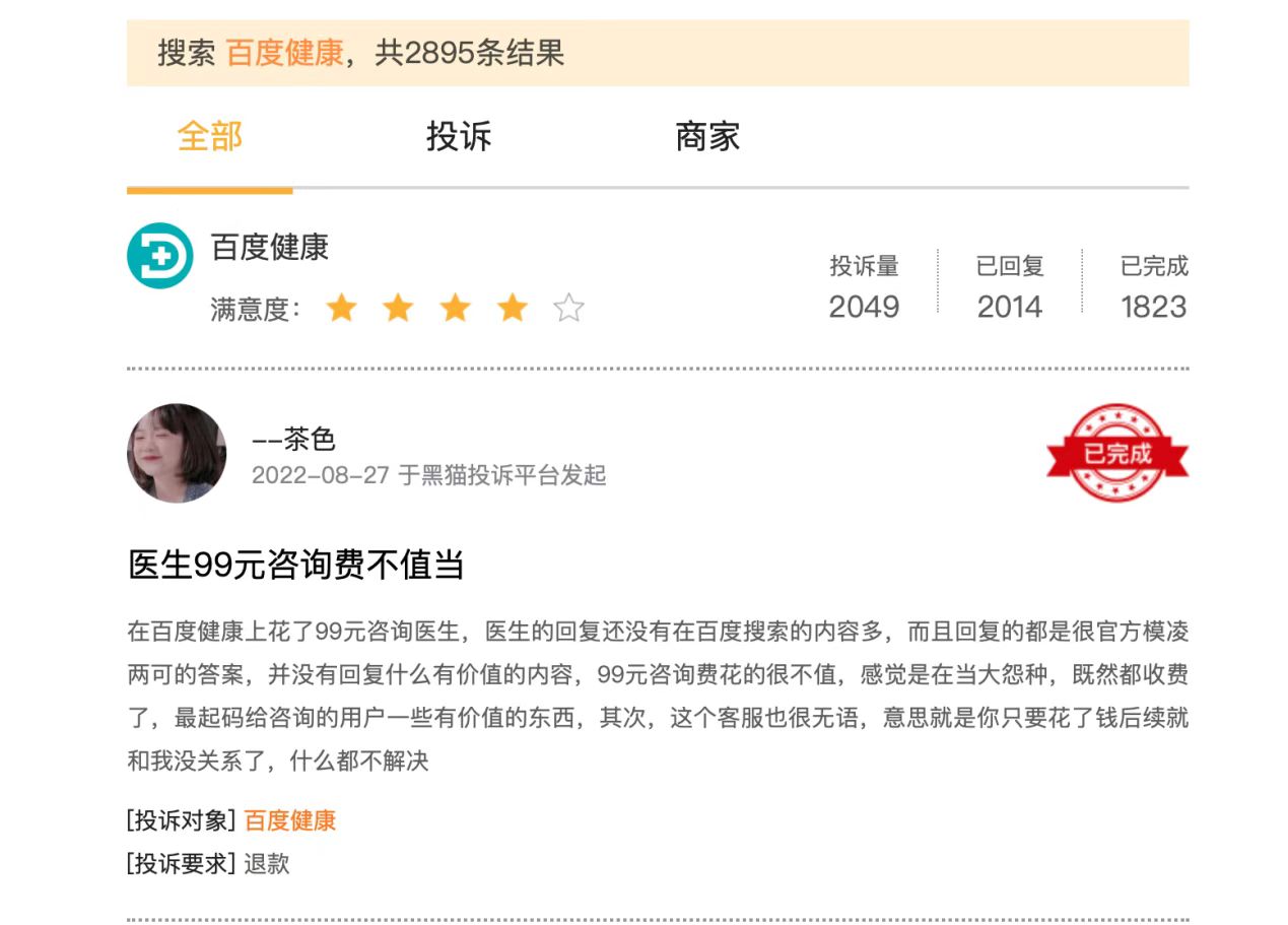 时至今日,在医疗健康赛道上,百度仍然难以重塑自己的信誉,使之变成一个用户可信赖的搜索产品和内容产品。以百度健康为例,从2020年建立以来,关于百度健康付费问诊无回复还不退款、医生冒名注册、职称不实的投诉和报道不在少数,从黑猫投诉平台上,可以看出一二。