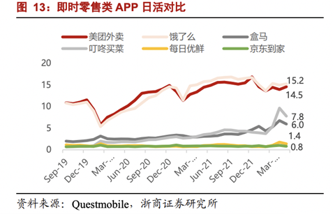 确实,美团作为本地生活的硬核选手,连阿里也讨不到好。看一组数据,感受下京东和美团即时零售领域的力量对比。