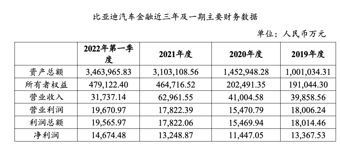 据披露,2021年,比亚迪金融营业收入6.2亿元,净利润1.3亿元。比亚迪金融净利润曾在2020年较上年下滑,次年回升。2022年一季度,比亚迪金融营业收入3.1亿元,净利润1.4亿元,超2021年全年净利润。